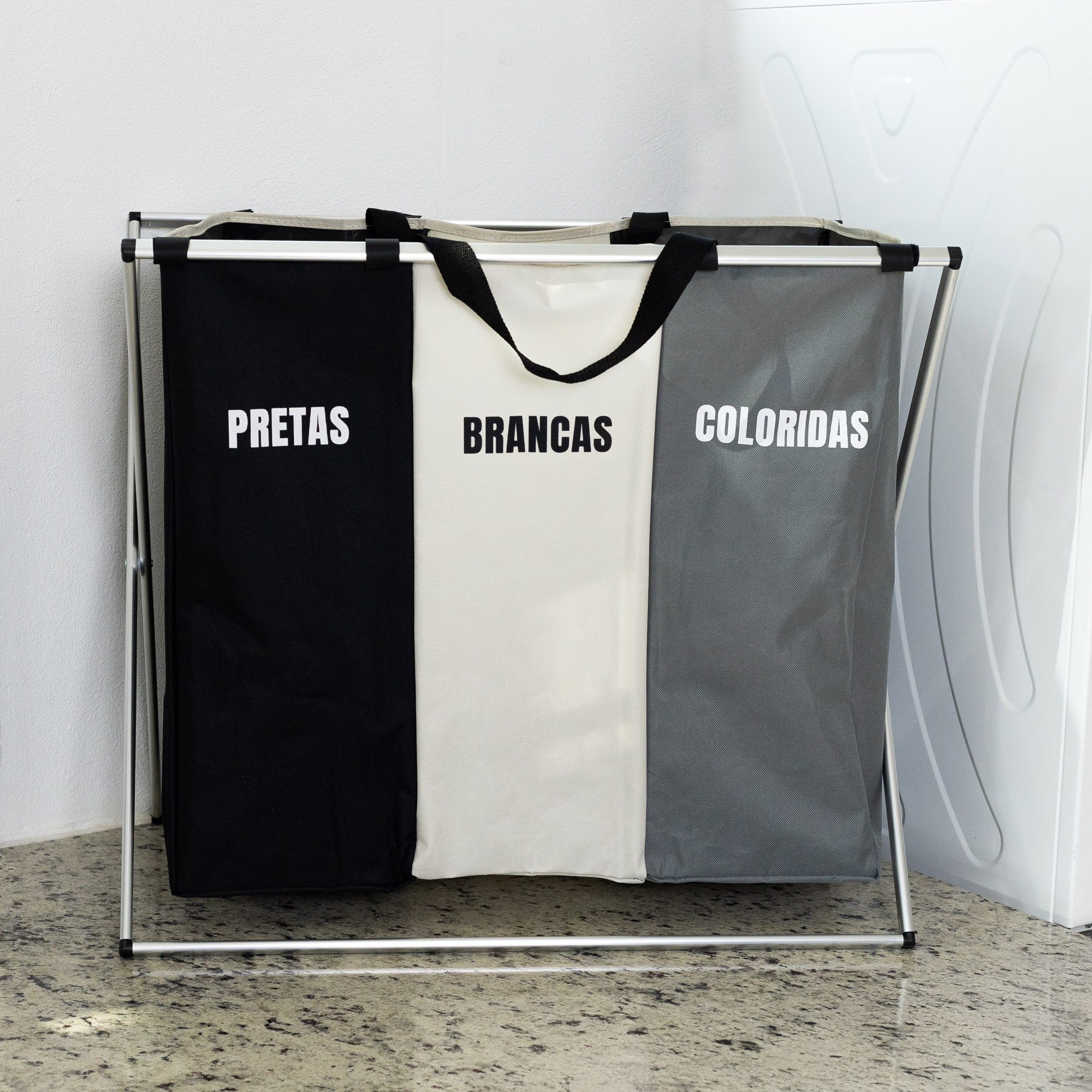 Com três compartimentos distintos, o cesto possibilita a separação de roupas claras e escuras e coloridas, facilitando a organização na hora da lavagem.