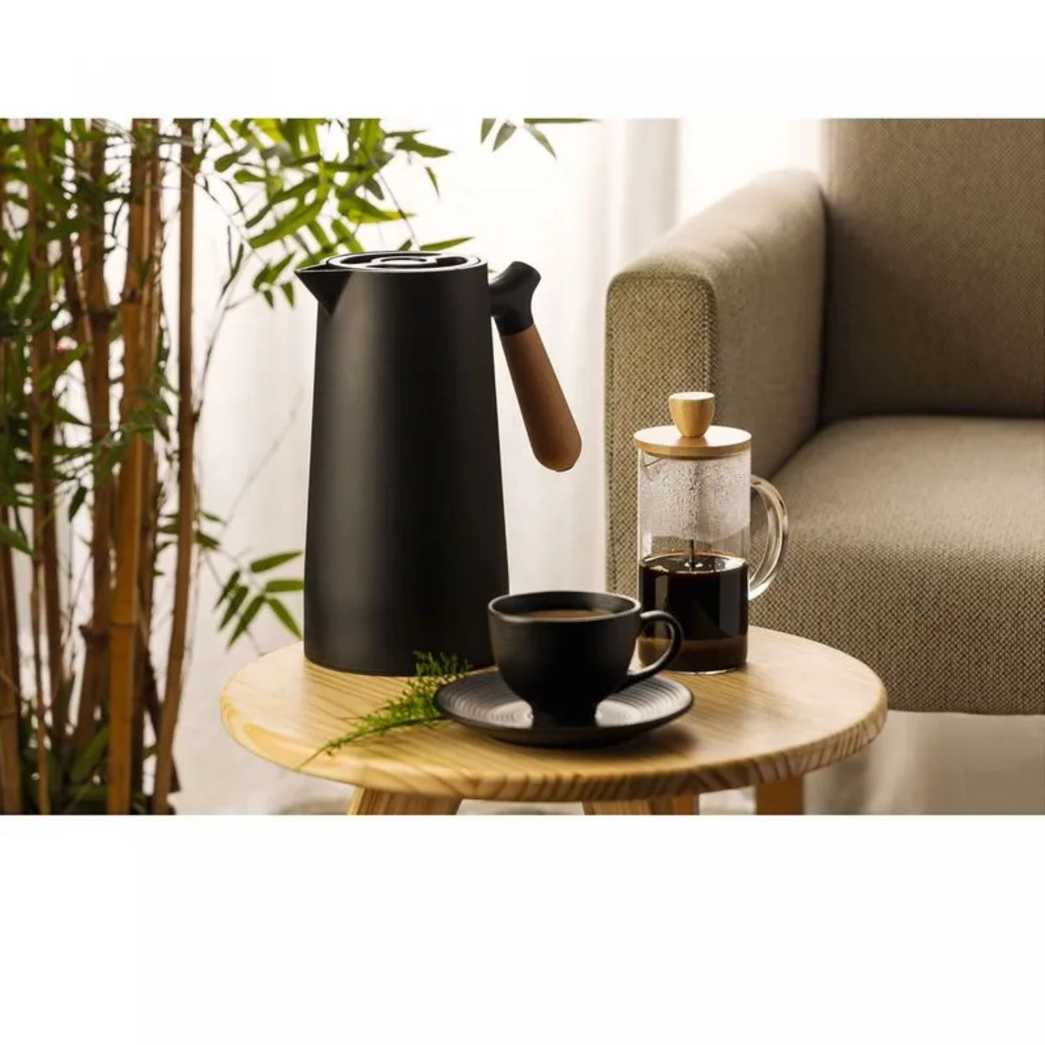 Adquira agora e deixe sua cozinha ainda mais bela com esta Garrafa Térmica de Plástico com Cabo de Madeira e Termômetro Nórdica Preta 1L da Wolff,uma garrafa que combina elegância e funcionalidade para manter suas bebidas na temperatura ideal.